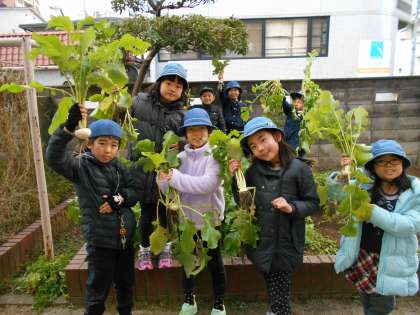3年生の学習園で10月に種まきをして、各クラス交代で水やりをしながら育ててきた「なにわの伝統野菜」である天王寺かぶらと田辺だいこんを13日の放課後に収穫しました。