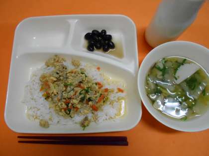 他人丼、すまし汁、黒豆の煮もの、牛乳