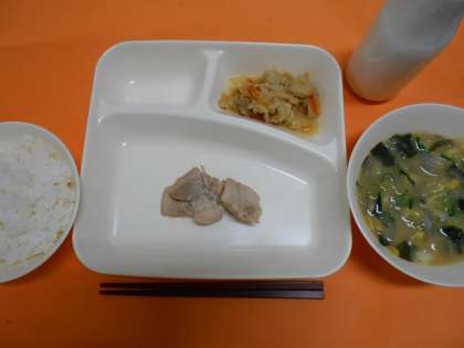 鶏肉のゆず塩焼き、みそ汁、切り干しだいこんのいため煮、ごはん、牛乳