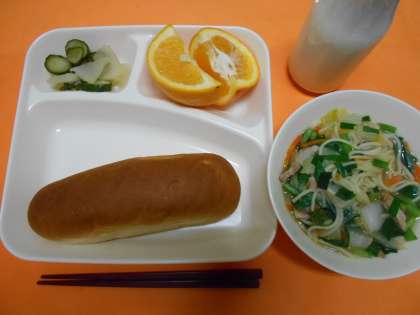 チャンポン、ピリ辛あえ、いよかん、黒糖パン、牛乳