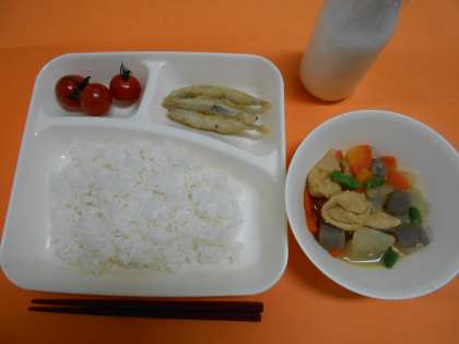 きびなごてんぷら、一口がんもとだいこんの煮もの、プチトマト、ごはん、牛乳