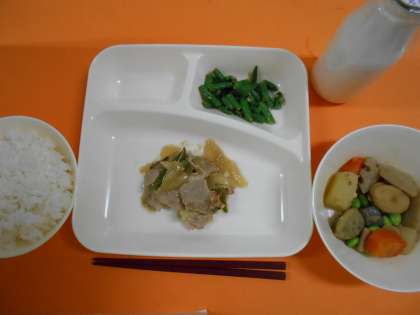 豚肉の甘辛焼き、三色あげ天と野菜の煮もの、三度豆のごまあえ、ごはん、牛乳