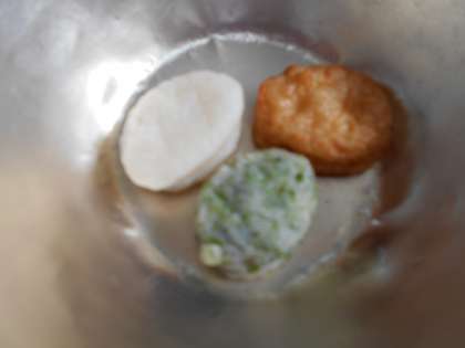 煮ものに使用した三色あげ天は、練り製品です。練り製品は、魚肉に食塩などを加え、よく練りつぶして成形し、加熱したものです。