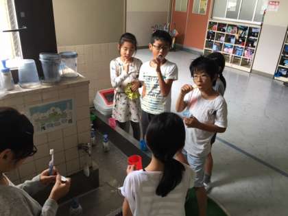 9月27日のフッ化物塗布から1週間、歯みがき週間として学校でも給食後の歯みがきに取り組みました。歯みがきをすると「口の中がすっきりして気持ちがいい。」という感覚を持った児童も多かったようです。給食後の歯みがきも子どもたちの習慣になるよう継続して声掛けをおこなっていきたいと思います。