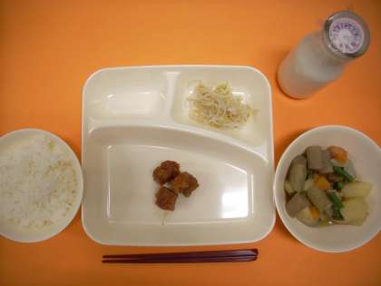 まぐろのオーロラ煮・じゃがいもと野菜の含め煮・もやしのゆずの香あえ・ごはん・牛乳