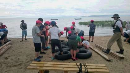 午前の湖上プログラム2が終わりました。いかだを作り湖上に浮かべて競争したり、湖岸でビーチバレーボールを使って遊んだりしました。いかだの競争はとても盛り上がったようです。この後、シャワーを浴びて昼食を食べ、五条小学校へ向かって帰路につきます。