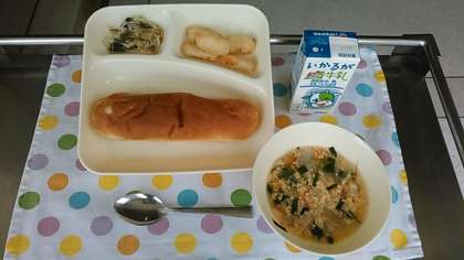 いかてんぷら、トマトと卵の野菜スープ、 チンゲイサイともやしのピリ辛あえ、おさつパン、牛乳