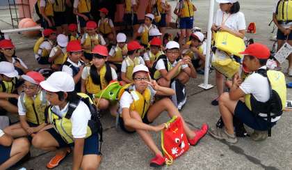 午後の海プログラム(カッター活動)の様子です。まずは、救命胴衣を着て準備万端です。準備ができて「はい、ピース。」