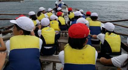 6mと9mのカッター(ボート)に分かれてみんなで協力して漕いで進みます。写真は9mのカッターです。声をそろえて、「えぃ。」(指導員さん)「そーれ。」(みんな)