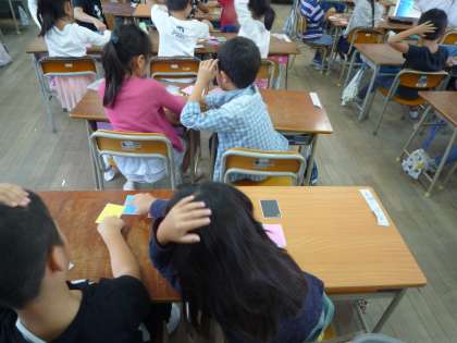 「Color Touch game」ではタニア先生の「Touch Touch Touch Touch Red!」のかけ声を聞き、ペアでその色のカードを指さしました。しっかりと色を聞き分けて楽しそうに活動することができました。次にグループで神経衰弱ゲームのように2枚ずつ裏返して、同じ色が揃ったらもらえるという「KARUTA game」をしました。裏返した時には、メンバーで「Red!」と発音し、2枚揃った時には、すごく嬉しそうな様子で盛り上がっていました。