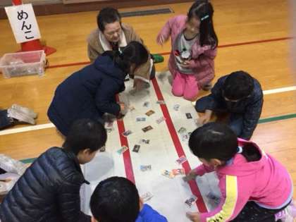 たくさんの地域の方々が来てくださり、けん玉、ヨーヨー、輪ゴムでっぽう、竹とんぼ、ビー玉、こま、おはじき、だるま落とし、お手玉、あやとり、まりつき、羽根つき、めんこ、紙飛行機などの昔遊びを教えて頂きました。知っている遊びもあれば、初めてする遊びもあり、子どもたちも興味津々でした。