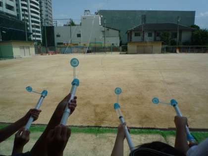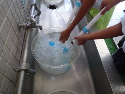 理科「とじこめた空気や水」の学習の様子です。空気を閉じ込めておすと、おしちぢめられ、体積が小さくなることがわかりました。写真は水鉄砲で遊んでいる様子です。水を閉じ込めておすとどうなるか、実験を通して考えていきたいと思います。