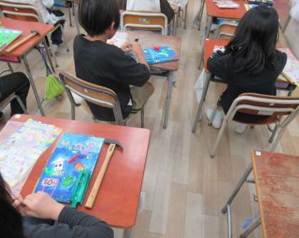 図画工作科の学習の様子です。3年生では初めて金づちを使います。ビー玉の動きを考えながら、安全に気を付けて釘を打つことができました。