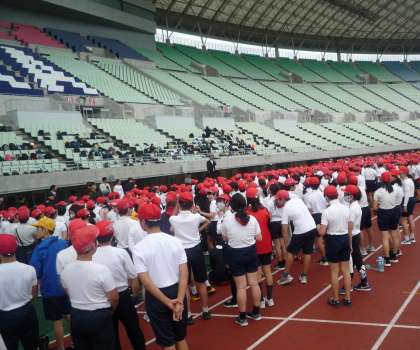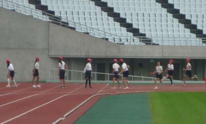 6年生が天王寺区の小学校が集まって実施された「スポーツ交歓会」に参加しました。多くの子どもたちにとって国際大会等も開かれるやヤンマースタジアム長居のトラックを走るのは初めての経験です。100メートル走やリレーを行いました。短い時間でしたがいい経験になったようです。