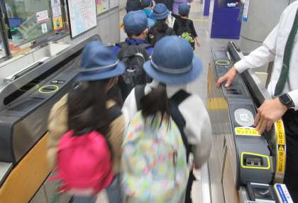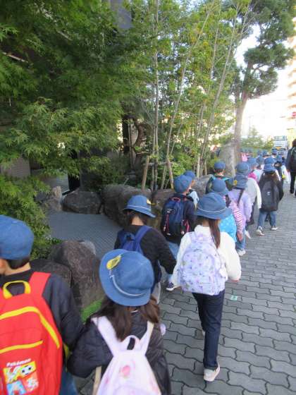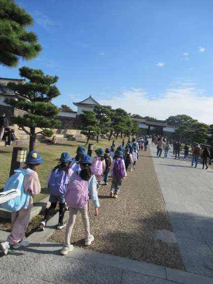 1年生が秋の校外学習で大阪城公園に行きました。生活科の「秋みつけ」の学習として、豊国神社の近くでどんぐりを拾いました。その後、お弁当を食べ、広場で遊びました。1年生にとっては公共交通機関をつかった初めての校外学習でしたが、マナーを守って電車に乗ることができました。