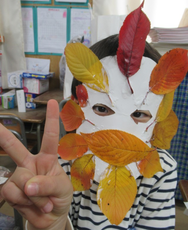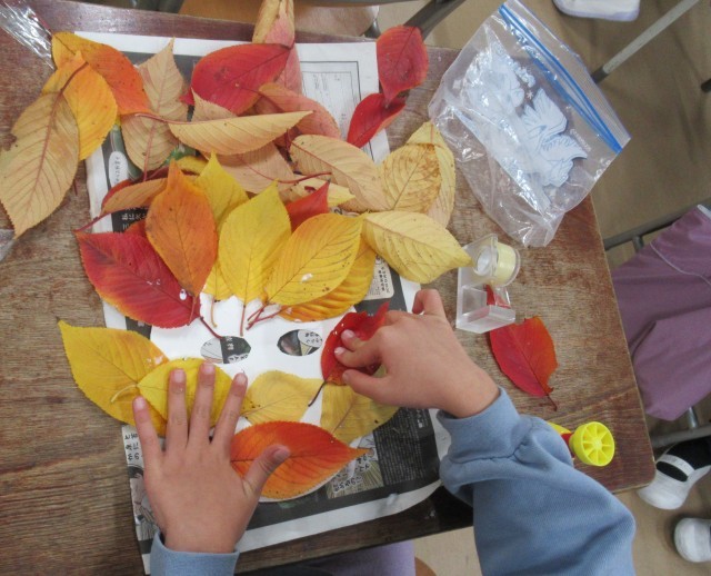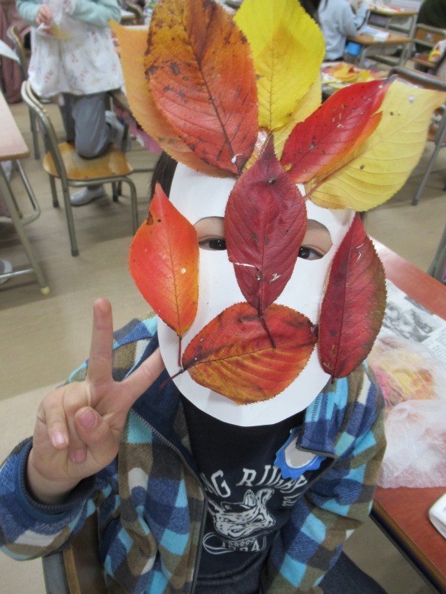 生活科の学習の様子です。秋をみつける学習として大阪城公園ではどんぐりを、学校内ではきれいな落ち葉を拾いました。この日は、落ち葉を台紙に貼って、おめんをつくりました。お気に入りの葉っぱを貼って、楽しく活動することができました。