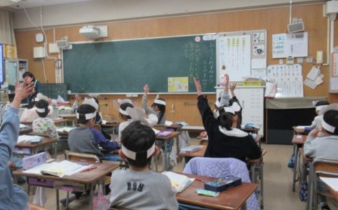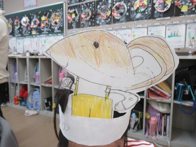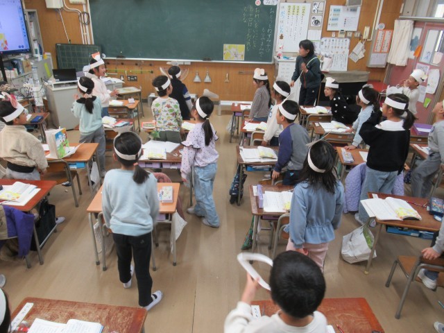 国語科の学習の時間です。物語「おとうとねずみチロ」の中心自人物チロの気持ちを読み取り、気持ちをこめて音読するために、チロのお面をつくりました。この日は、おばあちゃんにお礼を言うときのチロの気持ちを考えました。教科書に線を引き、自分の考えを発表しました。最後にチロのお面をかぶって「しましまのチョッキ、ありがとう」とチロになりきって大きな声で音読できました。