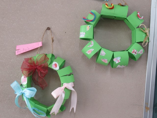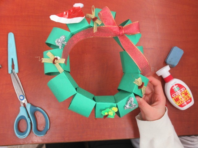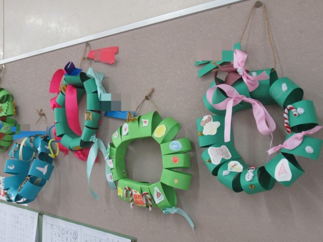 図画工作科の学習の様子です。画用紙を使ってクリスマスのリースを作りました。モールやリボンを貼って、カラフルで明るい作品に仕上げました。