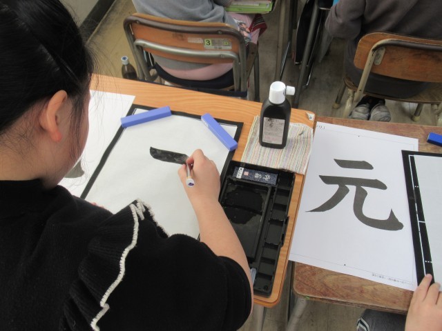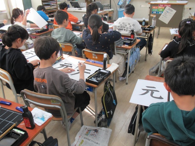 書写の学習の様子です。この日は毛筆で「元」という字を書きました。はらいやはねの形に気を付けて丁寧に書きました。
