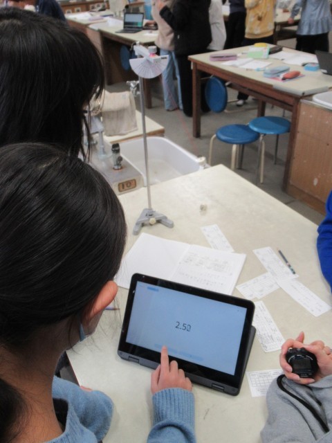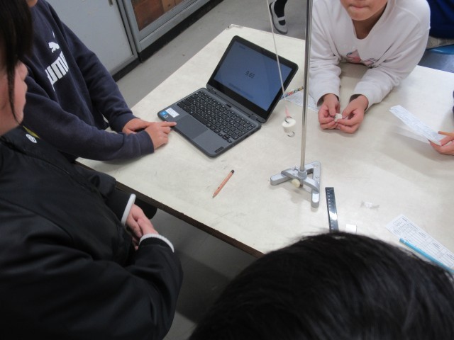 理科の学習の様子です。ふれ幅・ふりこの重さ・ふりこの長さの3つの条件を変えて、ふりこが1往復するのにかかる時間を計測しました。時間の平均を計算するためにタブレットを使いました。グループで協力して実験することができました。