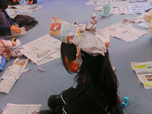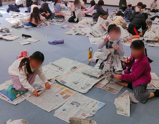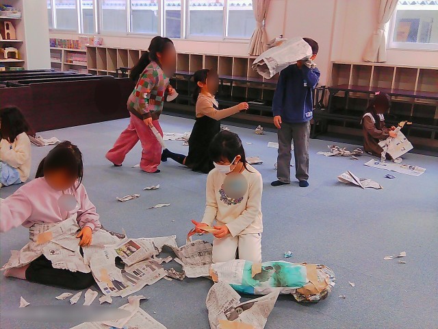 図画工作の学習の様子です。新聞紙を使って工作を楽しみました。新聞紙をやぶいたり、まるめたり、折り曲げたりして、いろいろなものを作ることができました。