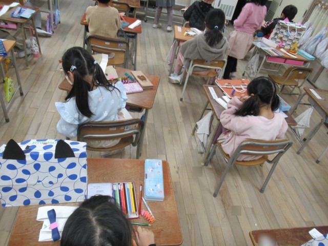 1年生では自宅から持ってきた紙袋を使ってリュックサックを作っています。
