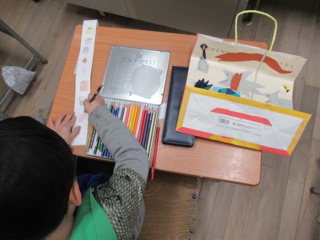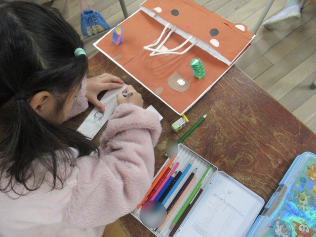 この日は、肩紐の部分を画用紙で作りました。「たのしく、にぎやかに」なるように、たくさん絵をかきました。