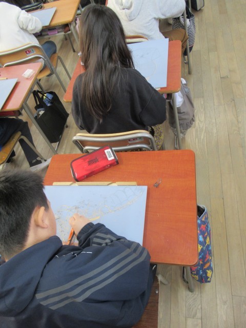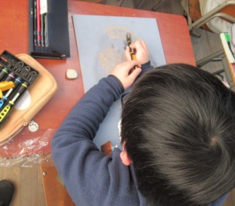図画工作科の学習の様子です。4年生は彫刻刀を用いた木版画に取組んでいます。題材は動物です。タブレットで動物の写真を調べて、下絵を描きました。三角刀や丸刀等を使い分けながら、安全に気を付けて彫り進めています。彫る向きに気を付けながら毛の流れを上手に表現していました。