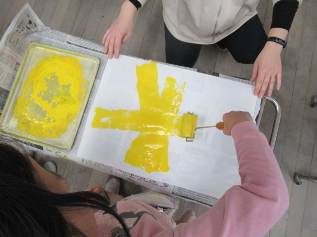 図画工作科の学習の様子です。国語科で学習する物語「スイミー」の仲間を紙版画で作ります。この日は、背景として、自分で決めた色をローラーで塗りました。今後、その上から黒いスイミーの仲間を印刷していく予定です。