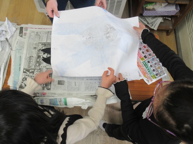 図画工作科の学習の様子です。先日の記事では、背景を作成している様子を紹介しました。今回は、スイミーの仲間を紙版画で作り、印刷している様子です。作った版にローラーでインクをつけて和紙に写し取りました。友だちと協力して取り組むことができました。