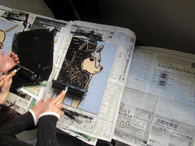 図画工作科の学習の様子です。5年生は木版画に挑戦しています。テーマは「干支」です。写真は、彫り終えた版にインクを付けて刷っている様子です。インクの量に気を付けて、上手に刷り上げることができました。