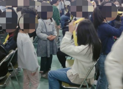卒業式の練習中に1年生がサプライズで来てくれました。1年生から歌とメダルのプレゼントをもらい、とても嬉しそうでした。