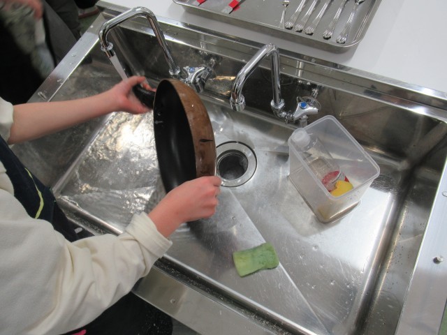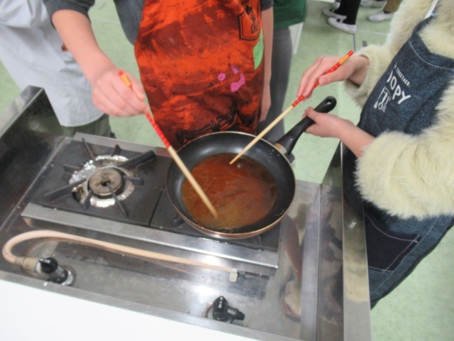 家庭科の学習の様子です。5年生最後の調理実習として、白玉だんごを作りました。白玉粉に水を混ぜて丸め、沸騰した湯でゆでました。フライパンで煮詰めた手作りのみたらしだれやきな粉をかけて食べました。片付けまでグループで協力して行うことができました。