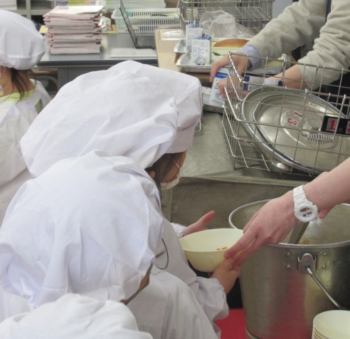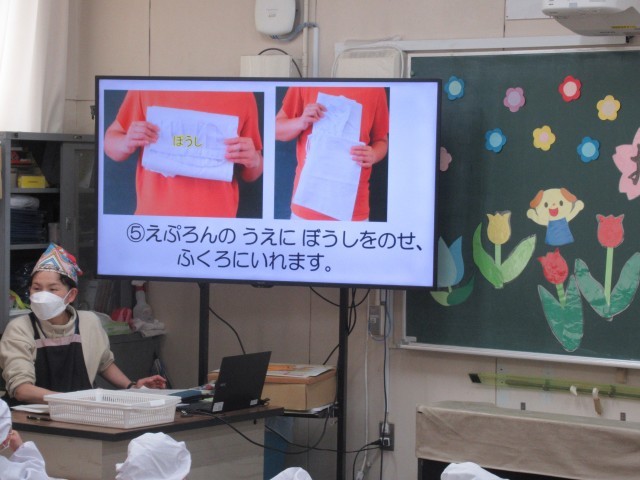 エプロンの着方や配膳の仕方などを先生から教えてもらいました。