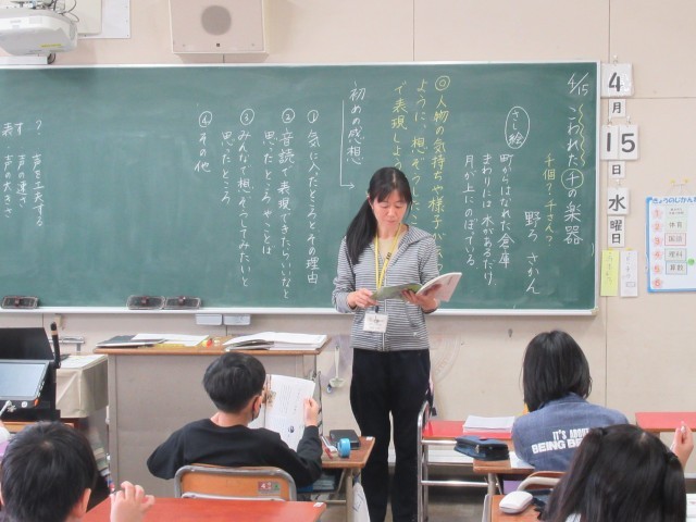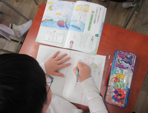 国語科の学習の様子です。物語「こわれた千の楽器」を読んで、初読の感想を書きました。落ち着いて学習に取組むことができていました。