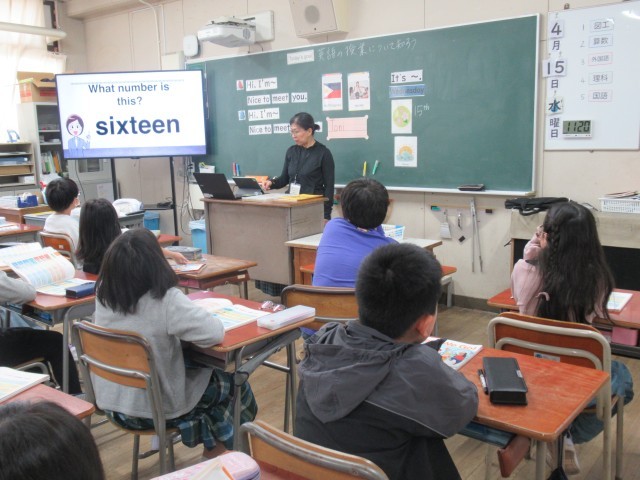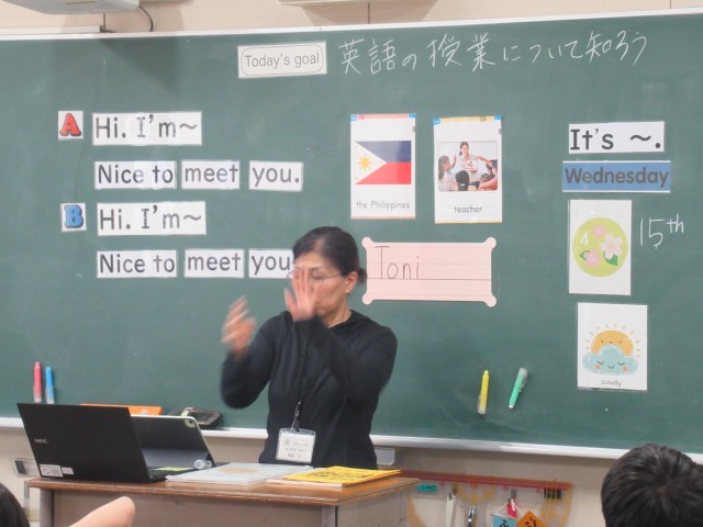 外国語の学習の様子です。5年生から教科として外国語の学習が始まります。この日は最初の授業としてあいさつ等の基本的なことを学びました。