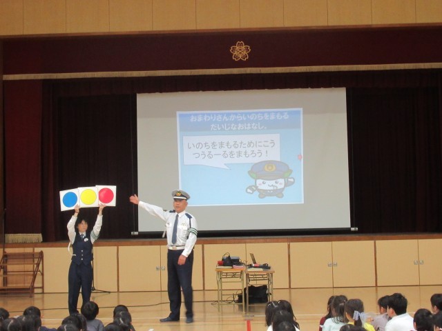 天王寺区役所と天王寺警察署の方に来ていただいて、「こどもあんぜんきょうしつ」を開いていただきました。不審者への対応や交通安全など、自分の安全を守ることについて、様々なことを教えていただきました。