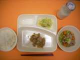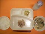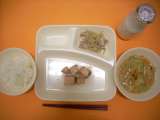 焼きとり・豚肉と野菜の煮もの・キャベツのかつお梅風味・ごはん・牛乳