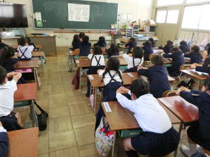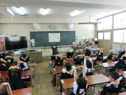 毎週木曜日の朝、全校で取り組んでいる姿勢体操。木曜日から1年生も仲間入り。♪にじいろに合わせてそったり ねじったり、体操の仕方を教えてもらいました。背筋をピン!いつも良い姿勢ができるように続けてがんばります。家庭でもご一緒に。