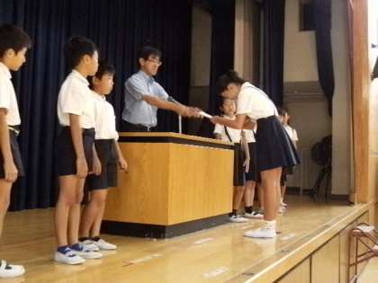 8月12日にあった大阪市の水泳記録会に出場した子ども達の記録証を校長先生から渡されました。