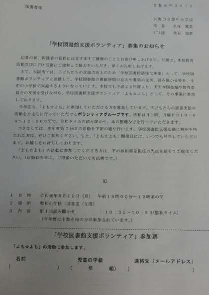 興味のある保護者の方は、5月13日(月)の聖和タイム(10:35〜10:50)に今年度第1回目の活動がありますので、いつでもご参加・ご見学ください。