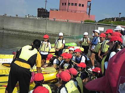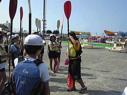 淡輪はよい天気です。カヌーの乗り方の説明を受けています。