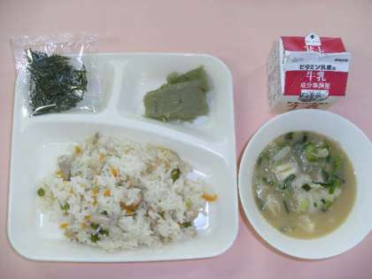 鶏肉、ちくわ、にんじん、旬のさんどまめを使用した混ぜごはんです。