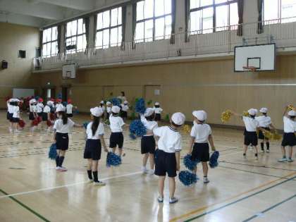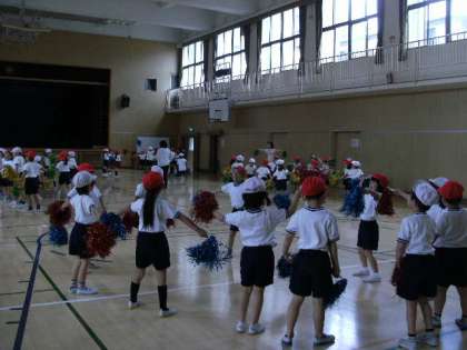 今日は、一年生が講堂で体型移動の練習をした後、運動場で通し練習をしていました。
