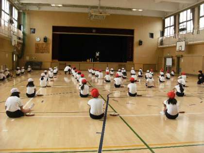 先生の話を聞くときは、背筋をまっすぐのばして体育座りで聞いています。一生懸命踊るとき、しっかり話しを聞くときとメリハリがついています。