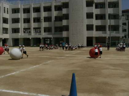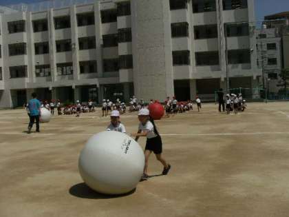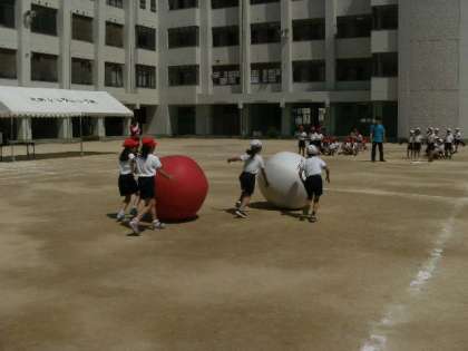 自分たちの身長と同じくらいの直径の大玉を友だちと協力して運びます。