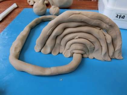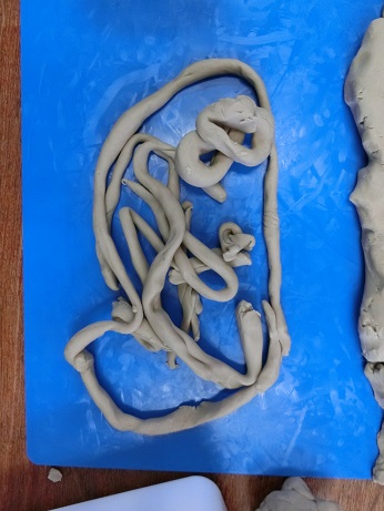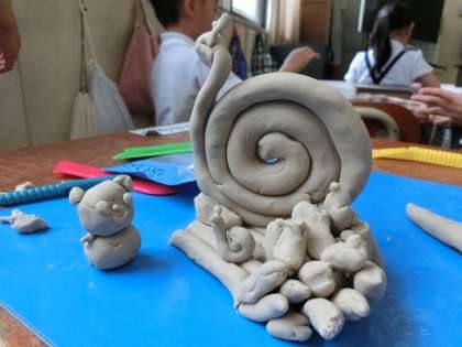 図画工作科で粘土をしました。ひもを組み合わせたり、ながーいひもをつくったり油粘土を楽しみました。せっかく作った作品ですが、チャイムが鳴ったら「ケースにしまって」に「え〜!」しかたなくふんわりふたをしてなおしている子もいました。