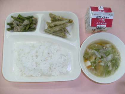 旬の生のさんどまめをゆで、豚肉と炒めて塩としょうゆで味つけしています。