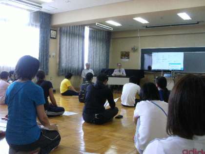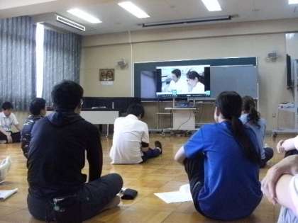 最初に学校内科医の喜多岡先生にご講義いただいた後、ビデオでアナフィラキシー症状が発症した際の対応を確認しました。そのあとはグループに分かれ、役割分担をして食物アレルギー緊急対応演習を行いました。