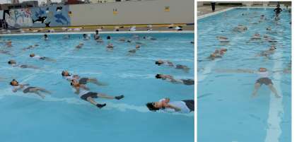 水着で泳いだ時と、服(体操服)を着て泳いだ時の違いを「服を着て泳ぐと重い」「疲れる」と実感することで、無理に泳がず、その場で浮いて助けを待つことの大切さを考えてもらいました。